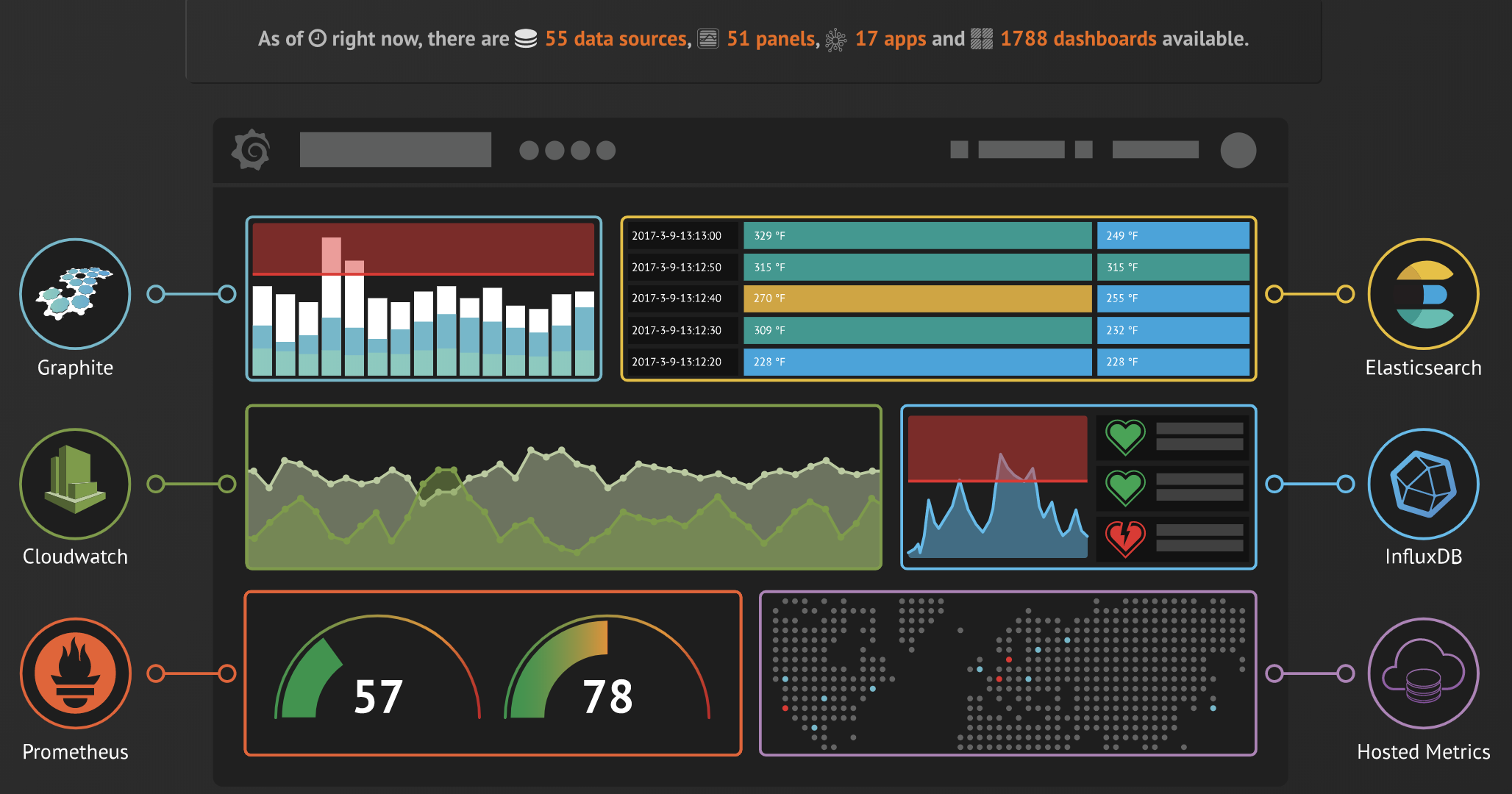 Grafana allows you to query, visualize, alert on and understand your metrics no matter where they are stored. Create, explore, and share beautiful dashboards with your team and foster a data driven culture.