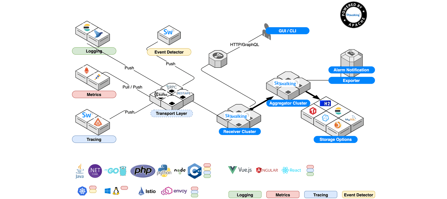 分布式系统的应用程序性能监视工具,专为微服务、云原生架构和基于容器(Docker、K8s、Mesos)架构而设计。提供分布式追踪、服务网格遥测分析、度量聚合和可视化一体化解决方案。